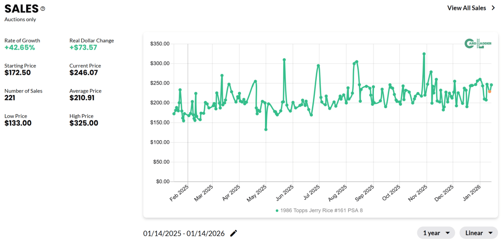 While the total population of graded Jerry Rice rookies is high, the demand is perpetual. It is one of the most liquid cards in the hobby.