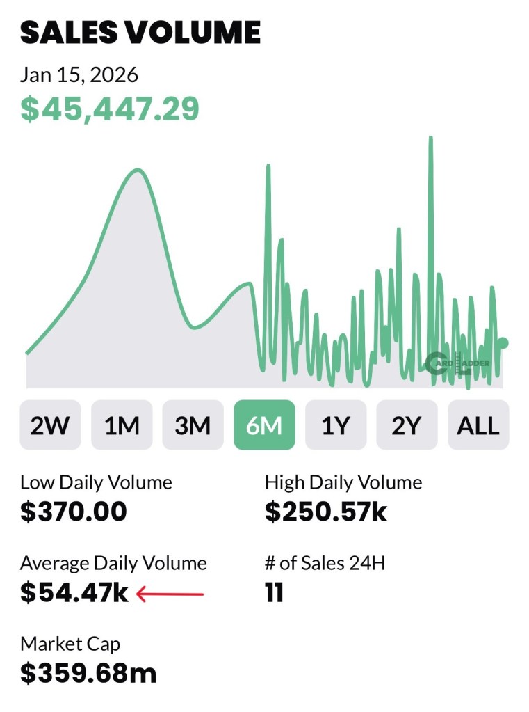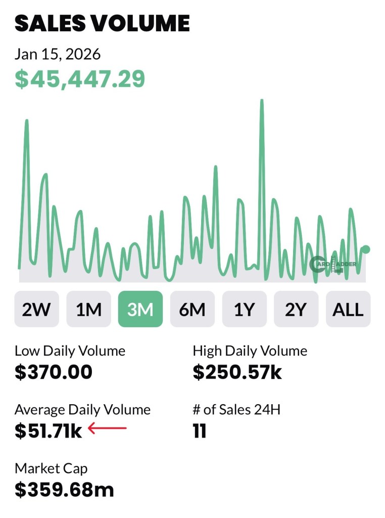 - The Effect: When a “Category Killer” card like that is at auction, liquidity often dries up elsewhere. High-end buyers “park” their capital to see where the record-breaking price lands before committing to other big purchases. This is why your Average Daily Volume has dropped from $54k (6M) down to $48k (1M).