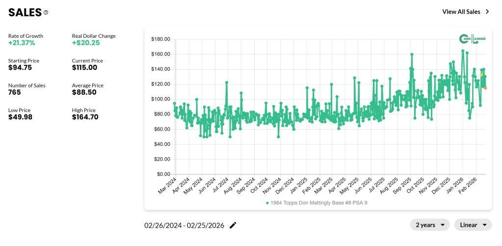 - High Liquidity: The volume is fantastic. With 765 sales over the last 24 months, this is a highly liquid asset. There is always an active market of buyers and sellers for a PSA 9 Mattingly.